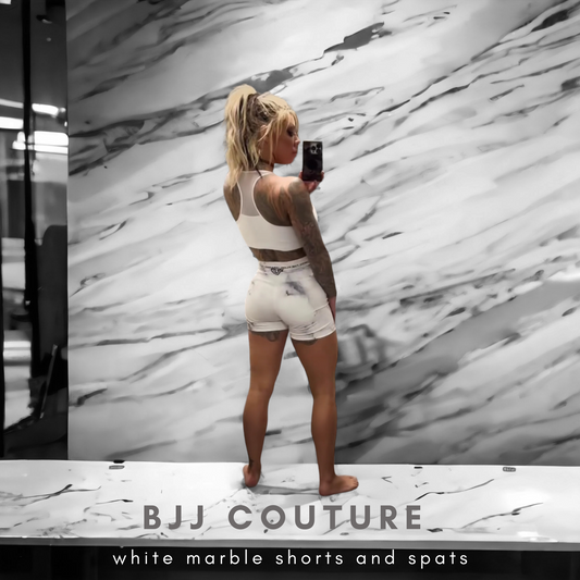 BJJ Couture Women's Compression Grappling Shorts - White Carrara Marble with Gold Veining and Indigo Ink Spills